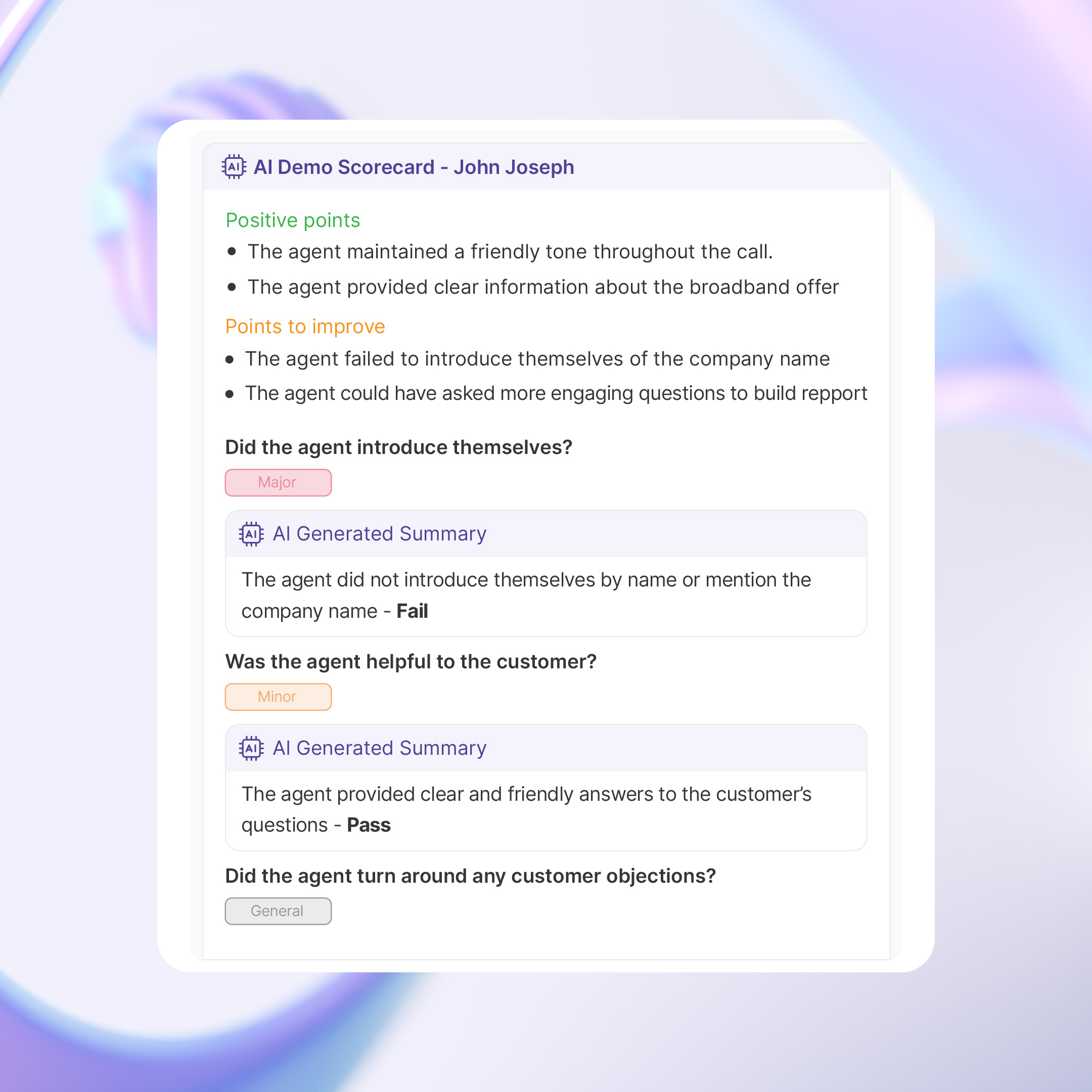 AI analyses conversations in real-time, scoring interactions based on key metrics like compliance, sentiment, and resolution quality.